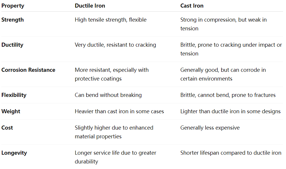 Walaupun kedua -dua bahan menawarkan rintangan kakisan yang baik, besi mulur cenderung bertahan lebih lama dalam persekitaran yang agresif seperti tanah lembap, di mana besi tuang boleh menghancurkan lebih cepat. Kekuatan yang meningkat dan permukaan yang lebih sukar juga membolehkan paip besi mulur untuk menahan bahan kimia rawatan air dengan lebih baik.